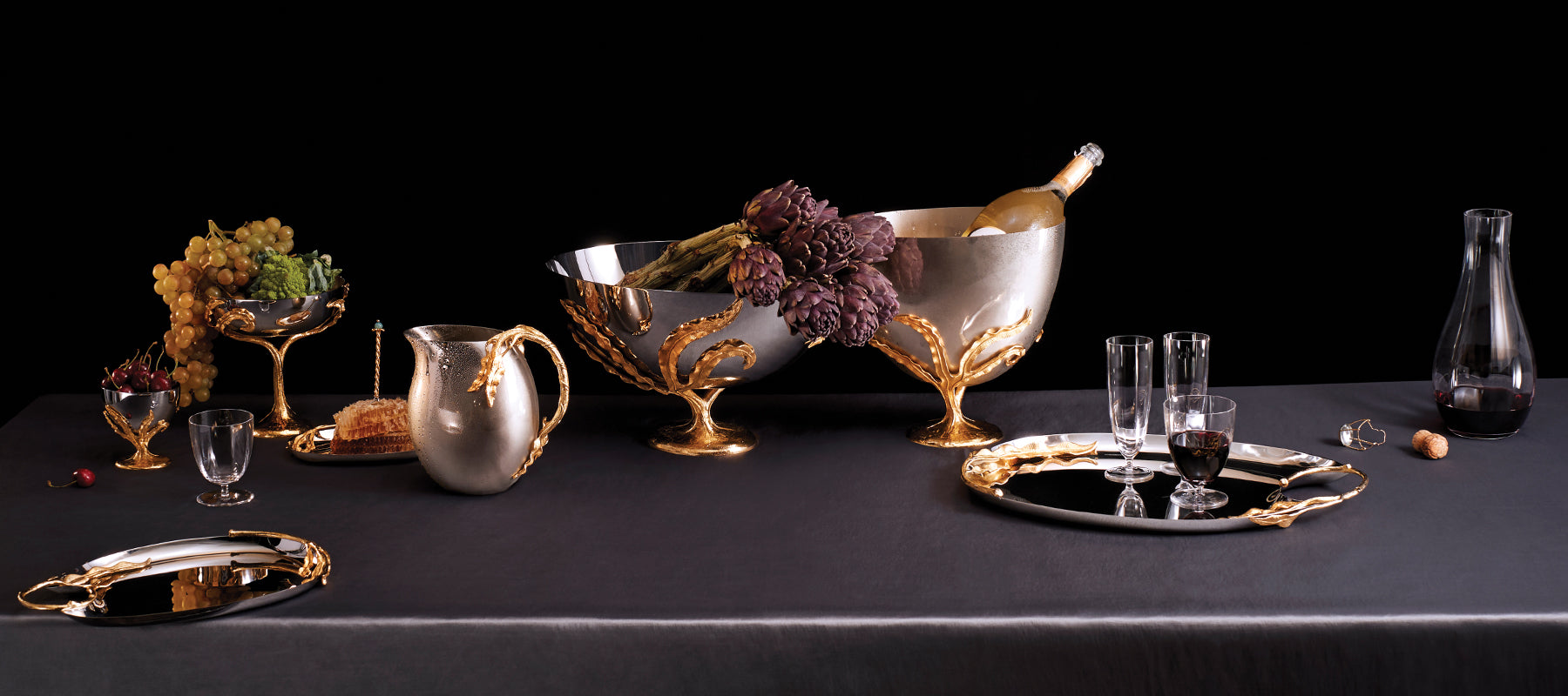 An ensemble of eight pieces that embodies elegance and craftsmanship. Each piece, meticulously crafted from stainless steel and adorned with 24k gold-plated accents, features a dynamic hand-sculpted fern motif showcasing the unparalleled talent of our master craftsmen. Including three sizes of trays, two sizes of big bowls, a champagne bucket, a pitcher, and two sizes of small bowls, the Fern Collection merges durability with opulent sophistication, transforming any dining experience into a celebration of refined luxury.