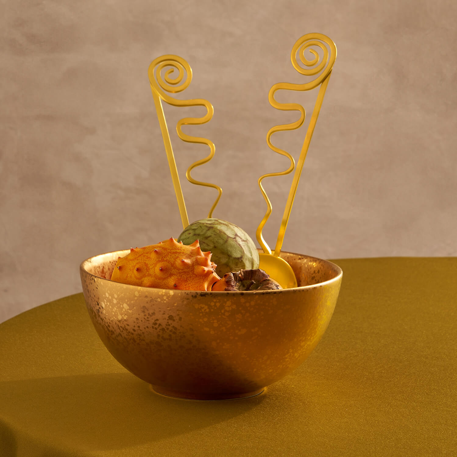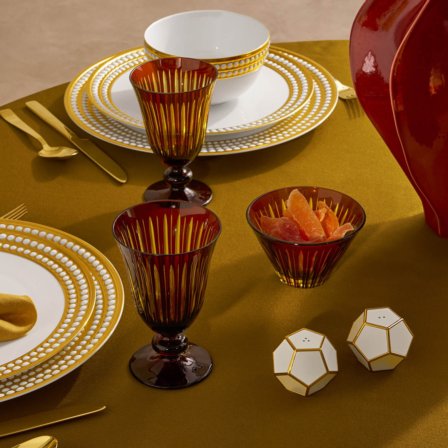 Perleé Gold sets the stage with its fine white porcelain and delicate 24k gold detailing, creating a table that feels radiant. Each piece carries a sense of ceremony, transforming the act of dining into a moment of quiet opulence. Paired sculptural, unique table accents, the setting comes alive with contrast, character and an exuberance that remains refined. It is elegance with warmth, designed to elevate intimate gatherings.
