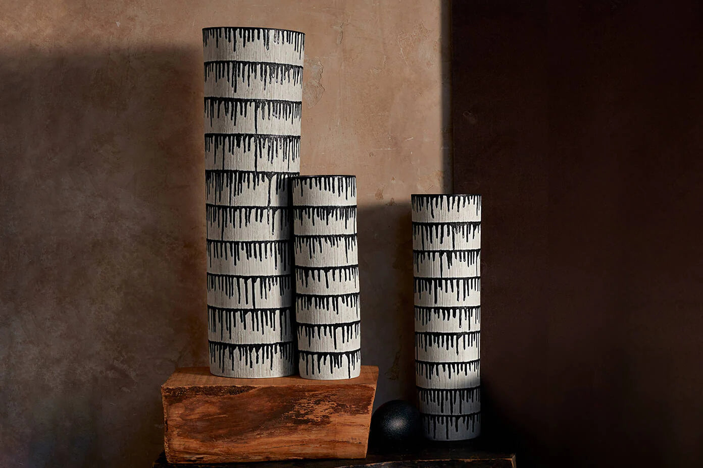 A handmade collection of vessels by the Japanese technique of indigo dyeing. Each hand-crafted piece is raked with grooves that allow the inky drops to flow.