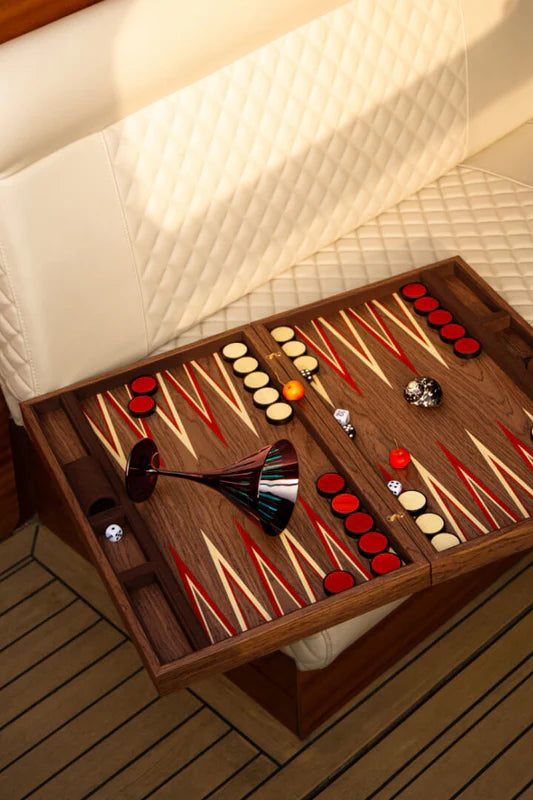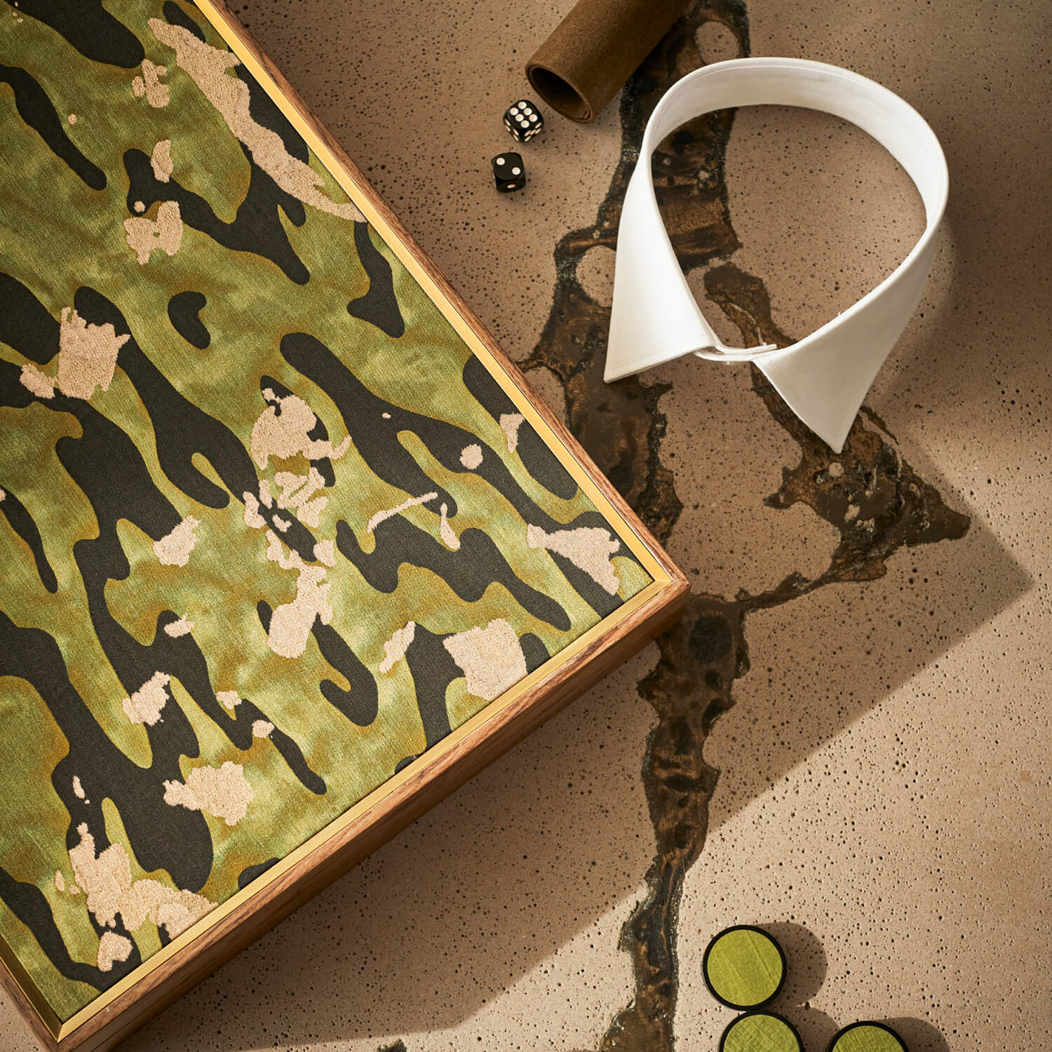 Games become objets d’art in this latest expression from L’OBJET x FORTUNY. Crafted with rich materials and wrapped in FORTUNY’s luxury fabrics, backgammon sets, dominoes, and illustrated cards turn tradition into treasure. Marquetry woodwork, rich tones, and bold patterns create sets that are both artful and heirloom-worthy — made to be displayed, treasured, and played for generations.