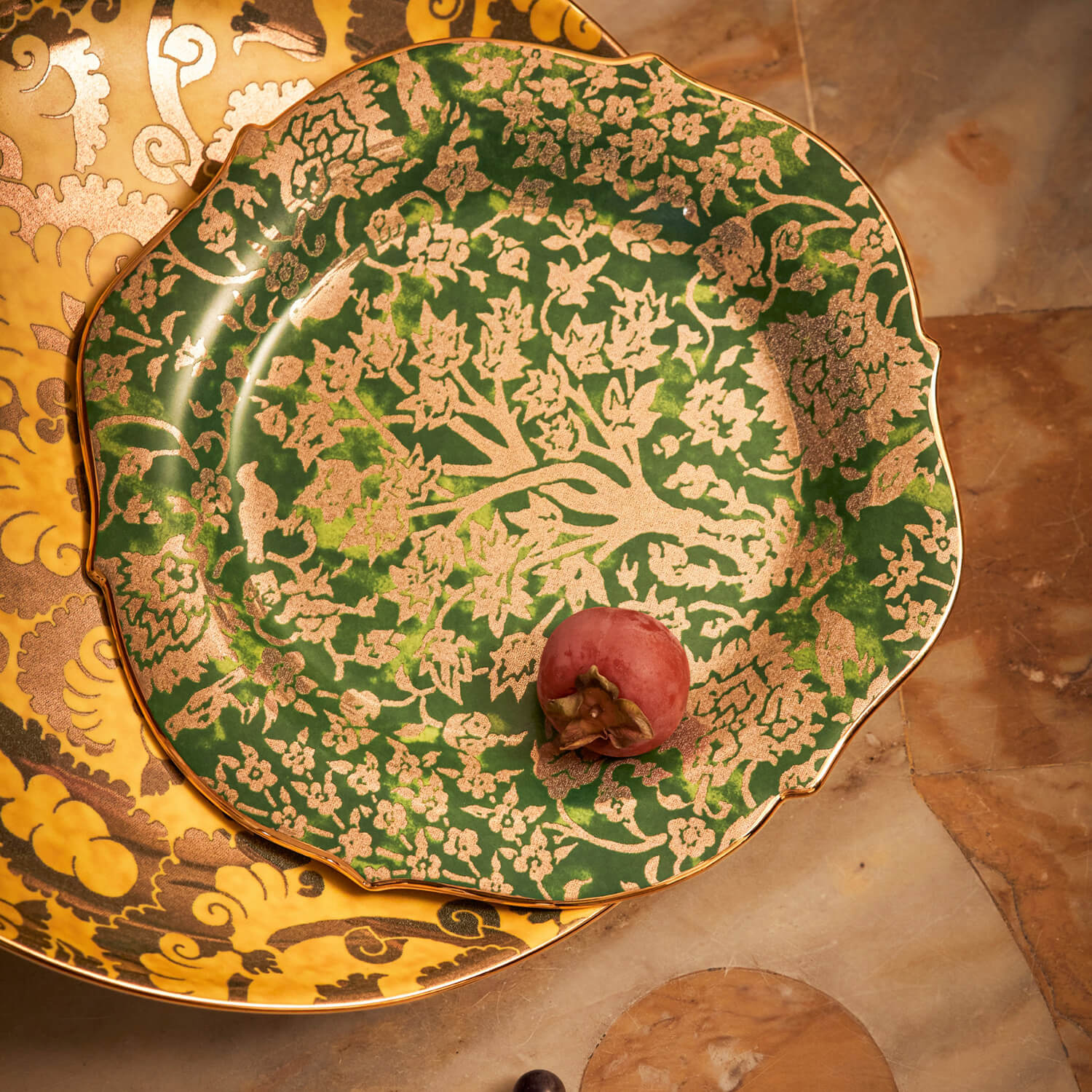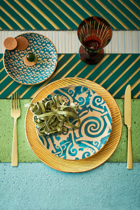 Create a table that tells a story in layers, where rich patterns and radiant hues come together in a celebration of FORTUNY’s iconic fabrics. This mix of new and archival L’OBJET x FORTUNY dinnerware invites you to design an opulent, expressive tablescape where every plate is a brushstroke of color, history, and refined artistry.