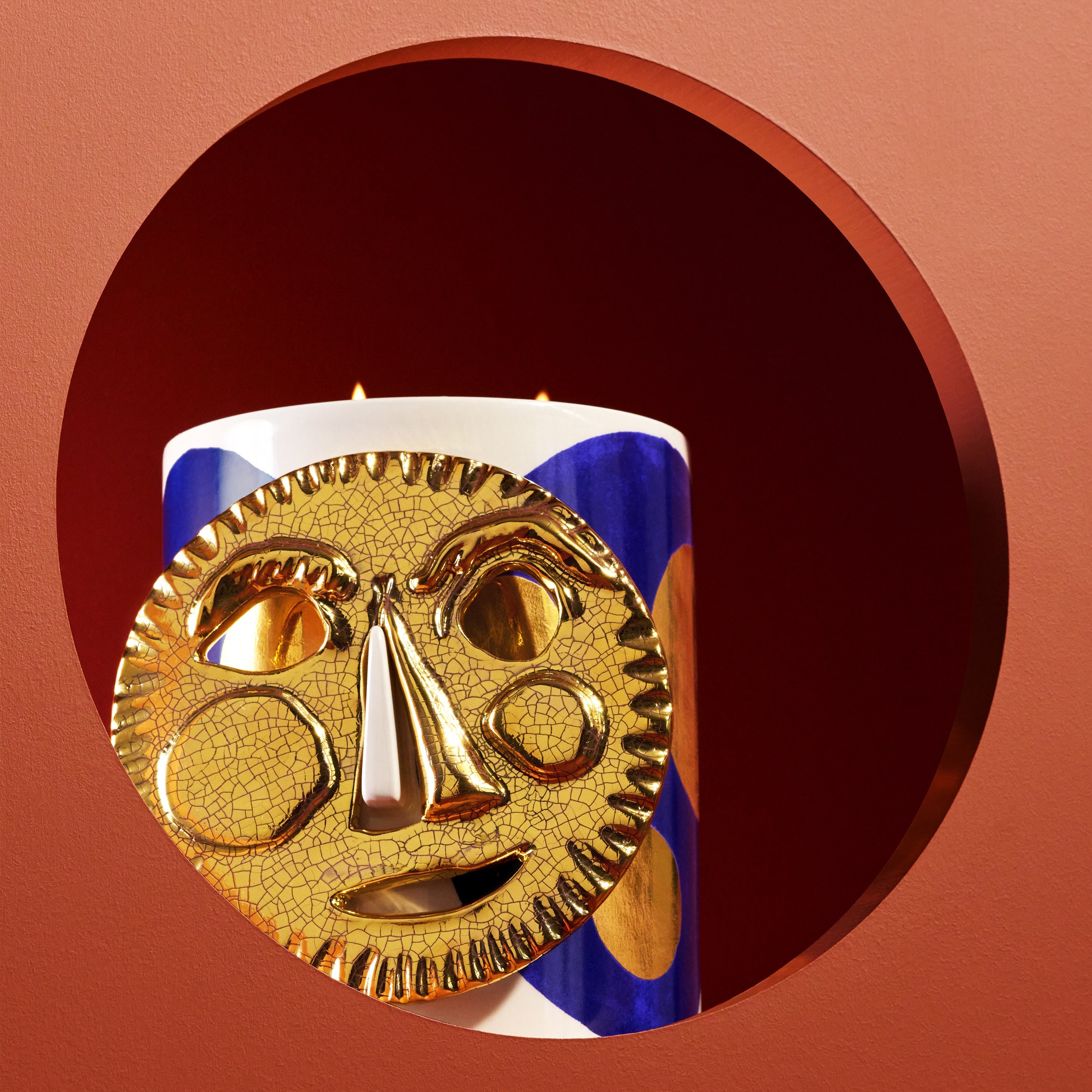 L'OBJET features its iconic veti-vert scent in the Ruan Hoffman collection. The BURNING DESIRE candle wraps the fragrance in a striking royal blue ribbon design with gold and platinum details. With its playful lid and intricate craftsmanship, the large MASK candle adds fun and elegance. The I CAN STILL SMELL YOU oil diffuser dazzles with it's gold-outlined smoky eye design.