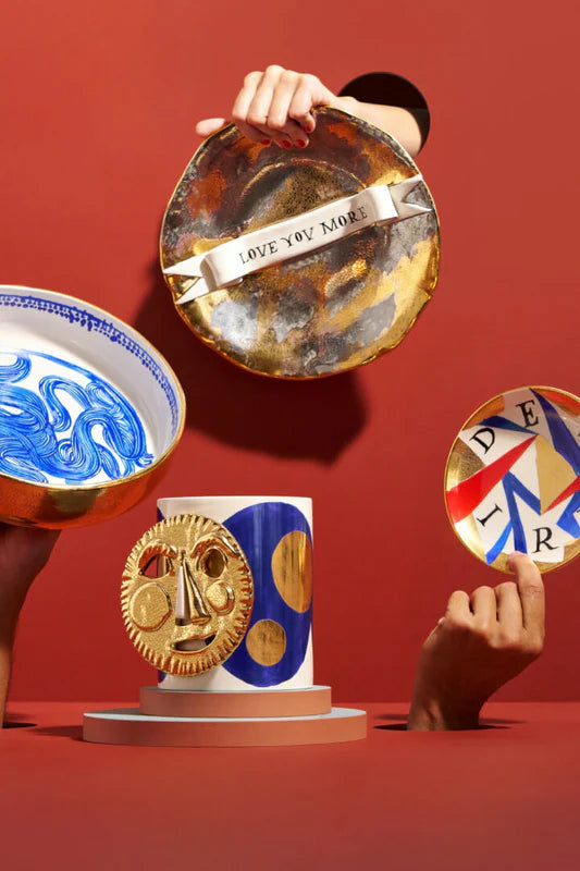 Meticulously crafted in stoneware and adorned with our signature 24K gold, this whimsical yet refined piece is an ode to bold creativyt.